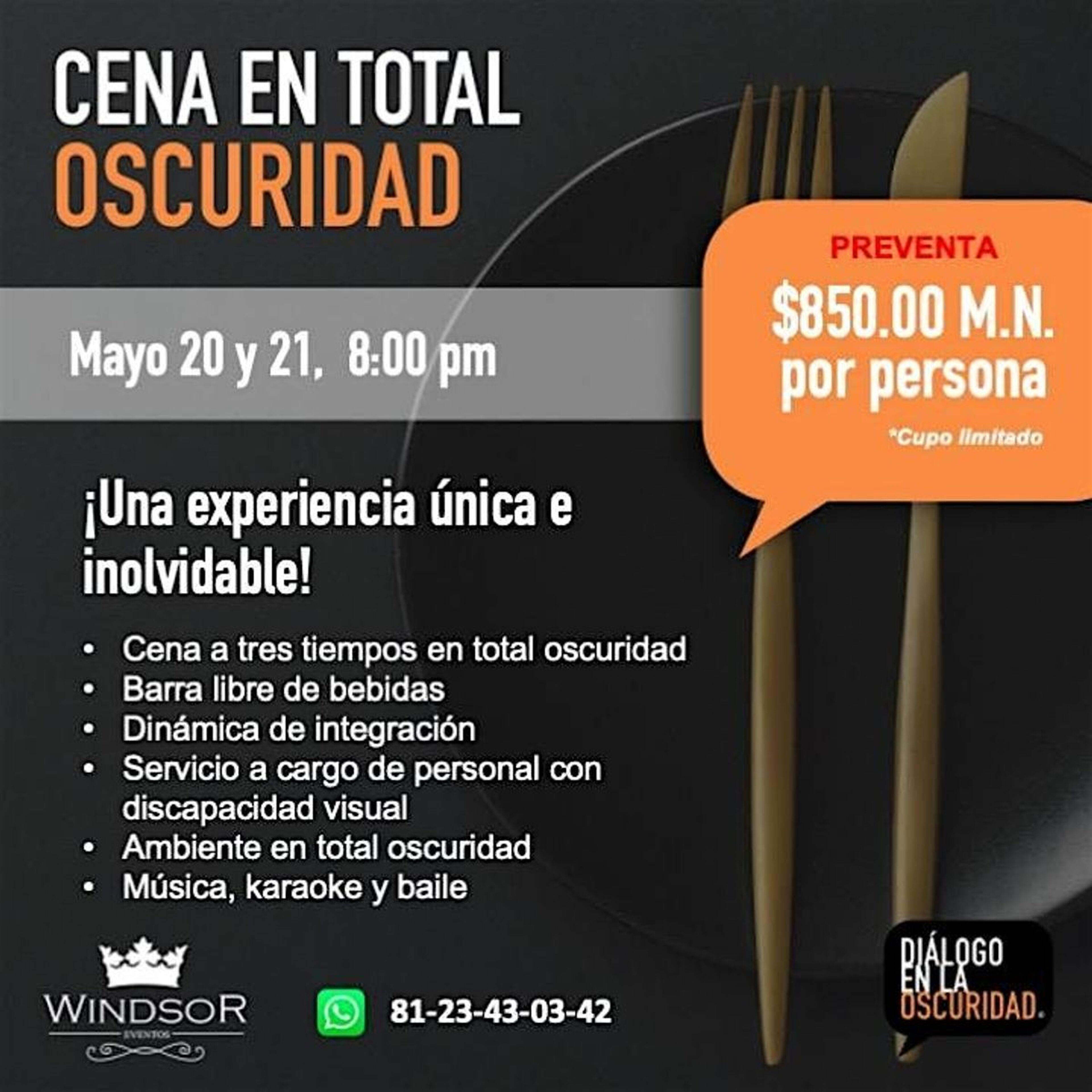 CENA EN TOTAL OSCURIDAD MIÉRCOLES 20 DE MAYO DEL 2026EventbriteWINDSOR EVENTOSSan Nicolás de los Garza, NLEMay 20, 2026