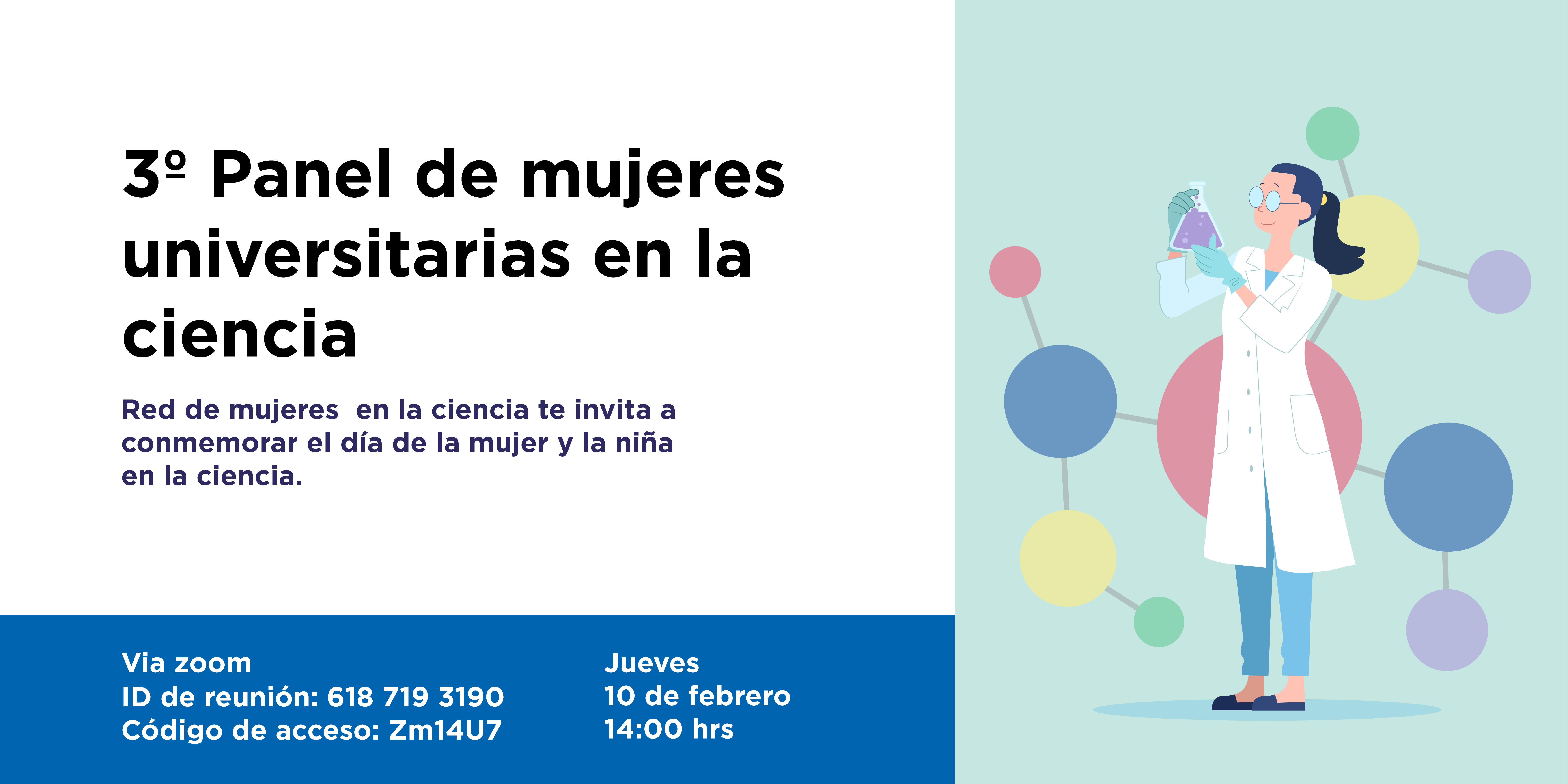 Red de Mujeres en la Ciencia te invita al 3er Panel de Mujeres Universitarias en la Ciencia edición 2022 🔬 por medio de una reunión en Zoom, el día jueves 10 de febrero a las 02:00 p. m (03:00 pm CDMX)
