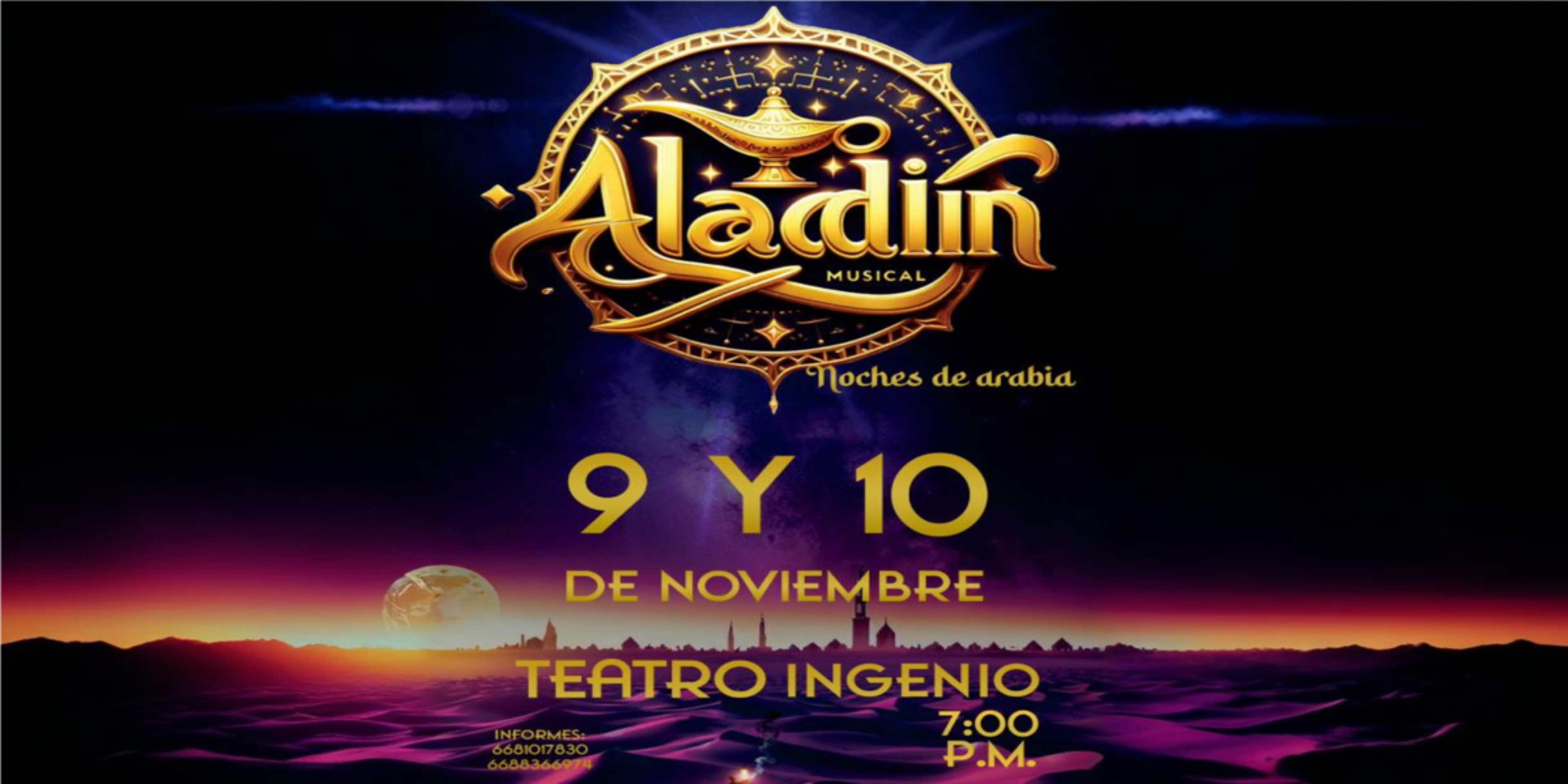 ¡Prepárate para una noche mágica con el musical de Aladdin en el Teatro Ingenio! Este espectáculo te transportará al mundo de Agrabah con impresionantes escenografías, vestuarios deslumbrantes y una banda sonora que te hará cantar y bailar.