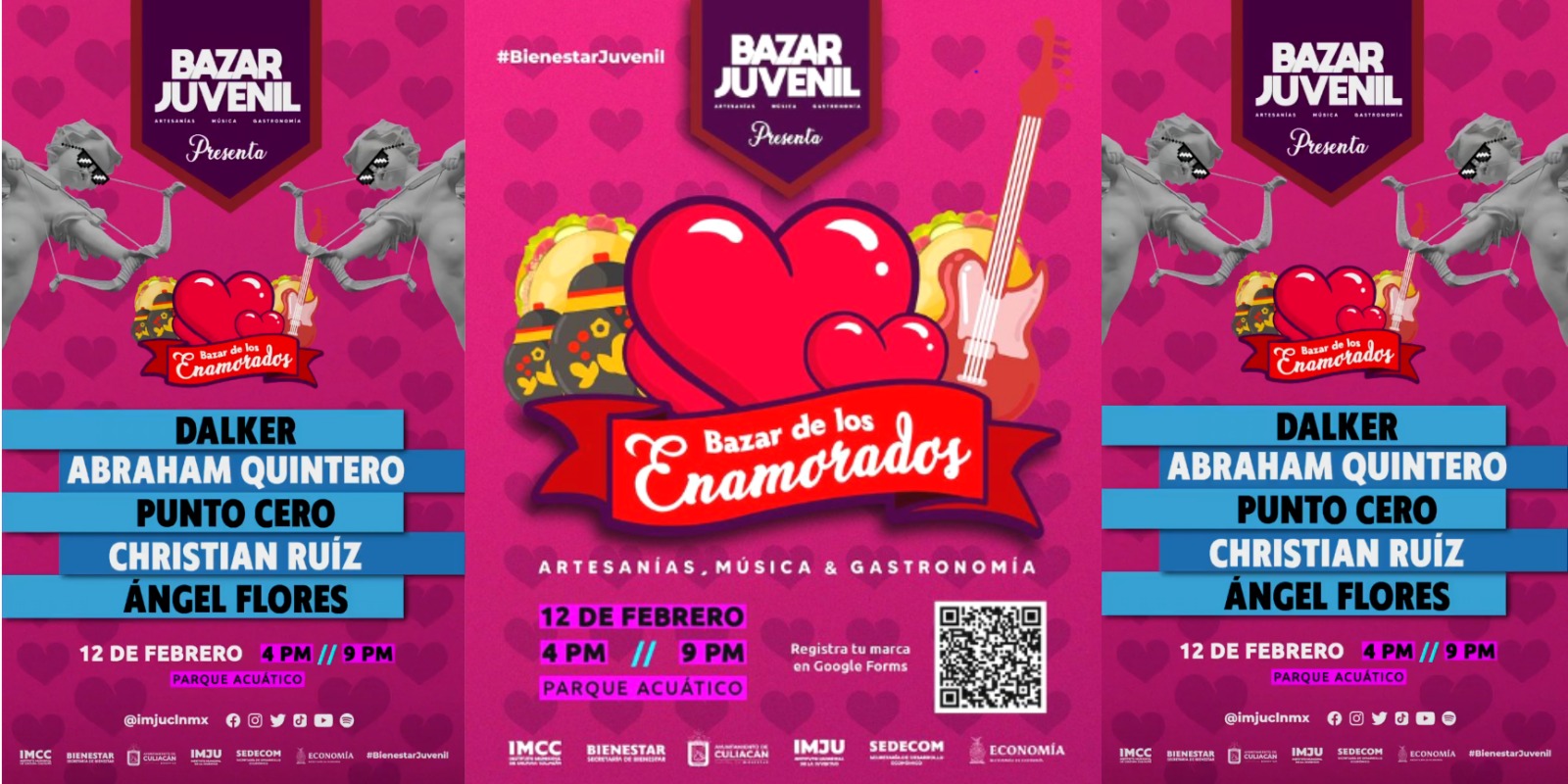 ¡Te esperamos este 12 de Febrero a las 4pm en el Parque Acuático al Gran Bazar Juvenil en su edición Bazar de los Enamorados 😍💕! Tienen preparado para ti un día de buena onda :) ¡Música romántica, marcas locales, rifas y más! 🥳 Con la presentación especial de Dalker, Abraham Quintero, Christian Ruíz, Punto Cero y Ángel Flores EN VIVO.