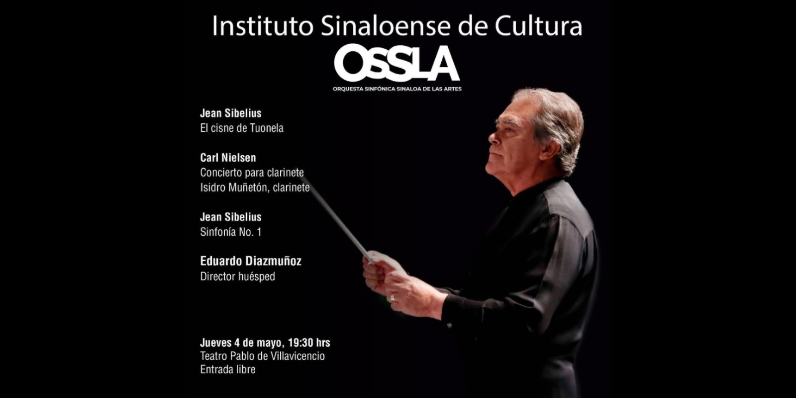 El programa incluye piezas de Nielsen y Sibelius, con el talento del clarinetista Isidro Muñetón como solista y el director huésped, el Mtro. Eduardo Diazmuñoz.
