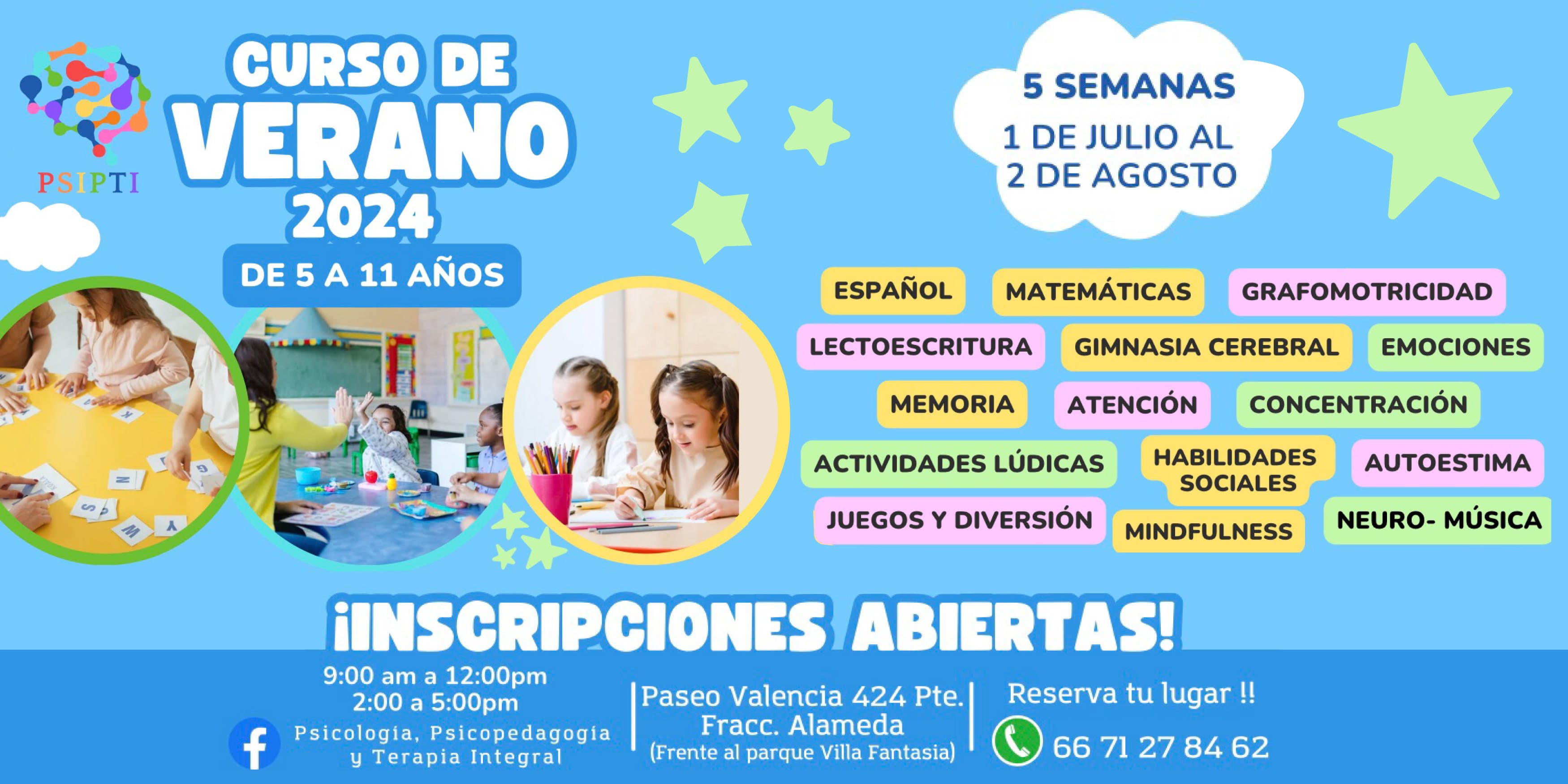 En PSIPTI diseñamos un programa especial para estas vacaciones de verano 2024 donde reforzaremos sus aprendizajes educativos; español, matemáticas, lectoescritura, memoria, atención, concentración, gimnasia cerebral, pero además abordaremos terapias grupales para mejorar su autoestima, emociones, habilidades sociales, técnicas de autocontrol y relajación (mindfulness) actividades didácticas, juegos, dinámicas y mucha diversión.