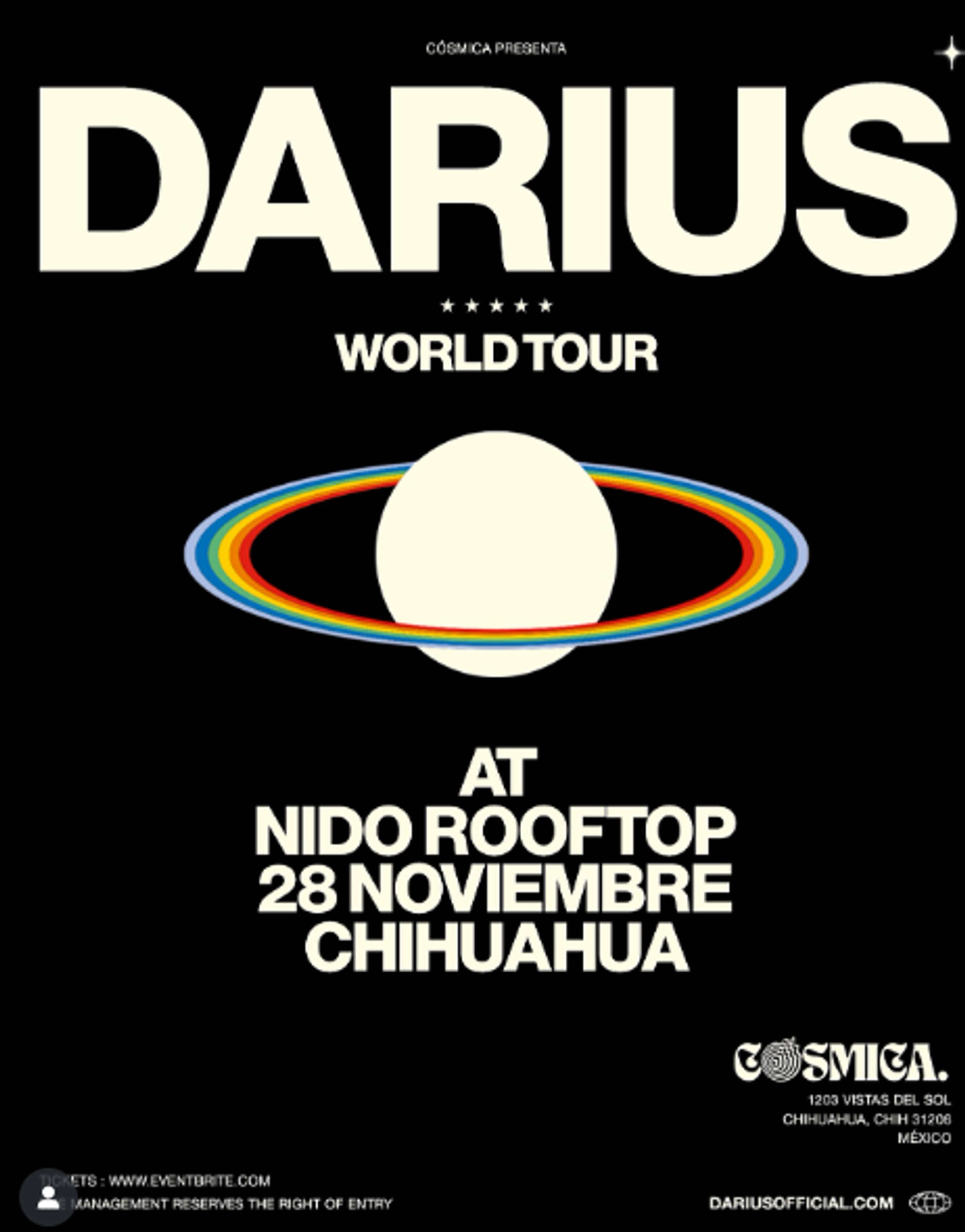 Organizado por Cósmica MX, un colectivo emergente que ha traído a la ciudad experiencias sonoras únicas, este debut de Darius marca un hito en la escena electrónica del norte de México. Parte de su gira por México 2025, este show conecta a Chihuahua con la vanguardia musical global.