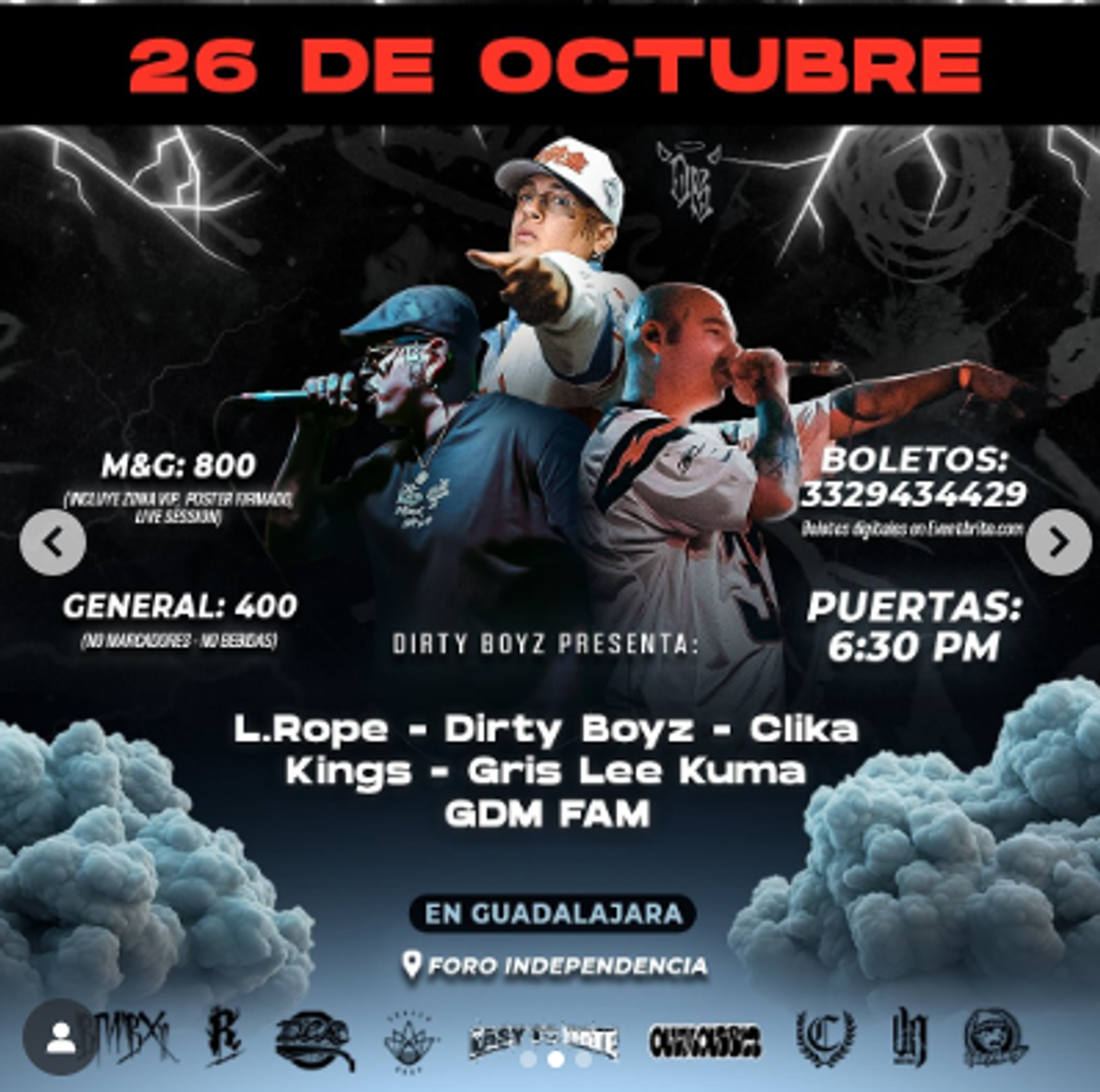 Rich Vagos, Clika Kings, Homegrown Mafia y Dirty Boyz Crew respaldan la trayectoria de estos artistas que han marcado un antes y un después en la cultura urbana mexicana. Esta fecha en Guadalajara es un encuentro con lo mejor del hip hop nacional, en un recinto emblemático para la música independiente.