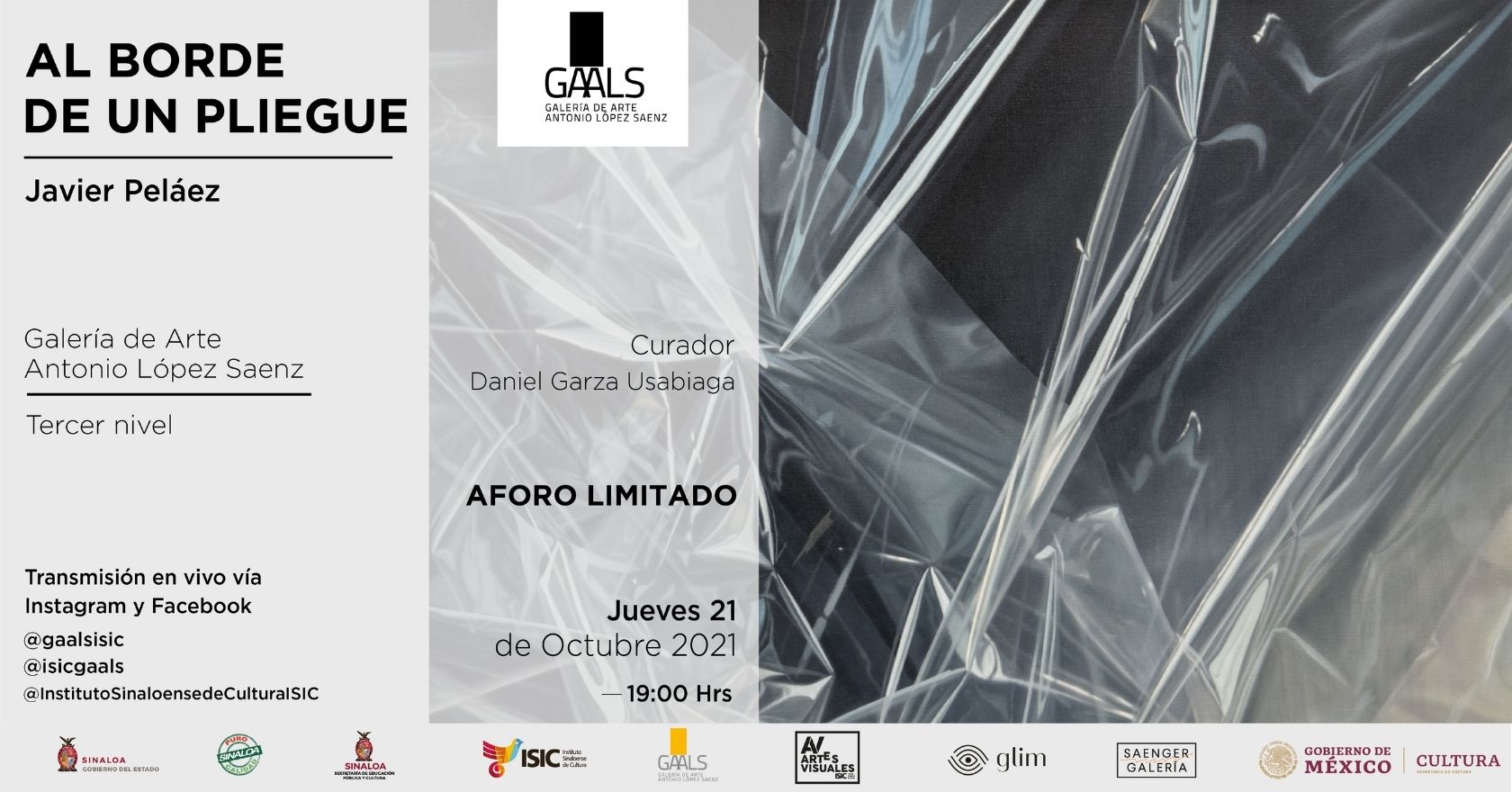 El Instituto Sinaloense de Cultura a través de la Galería de Arte Antonio López Sáenz y en coordinación con Saenger Galería y Glimartería, se complacen en invitar a la inauguración de la