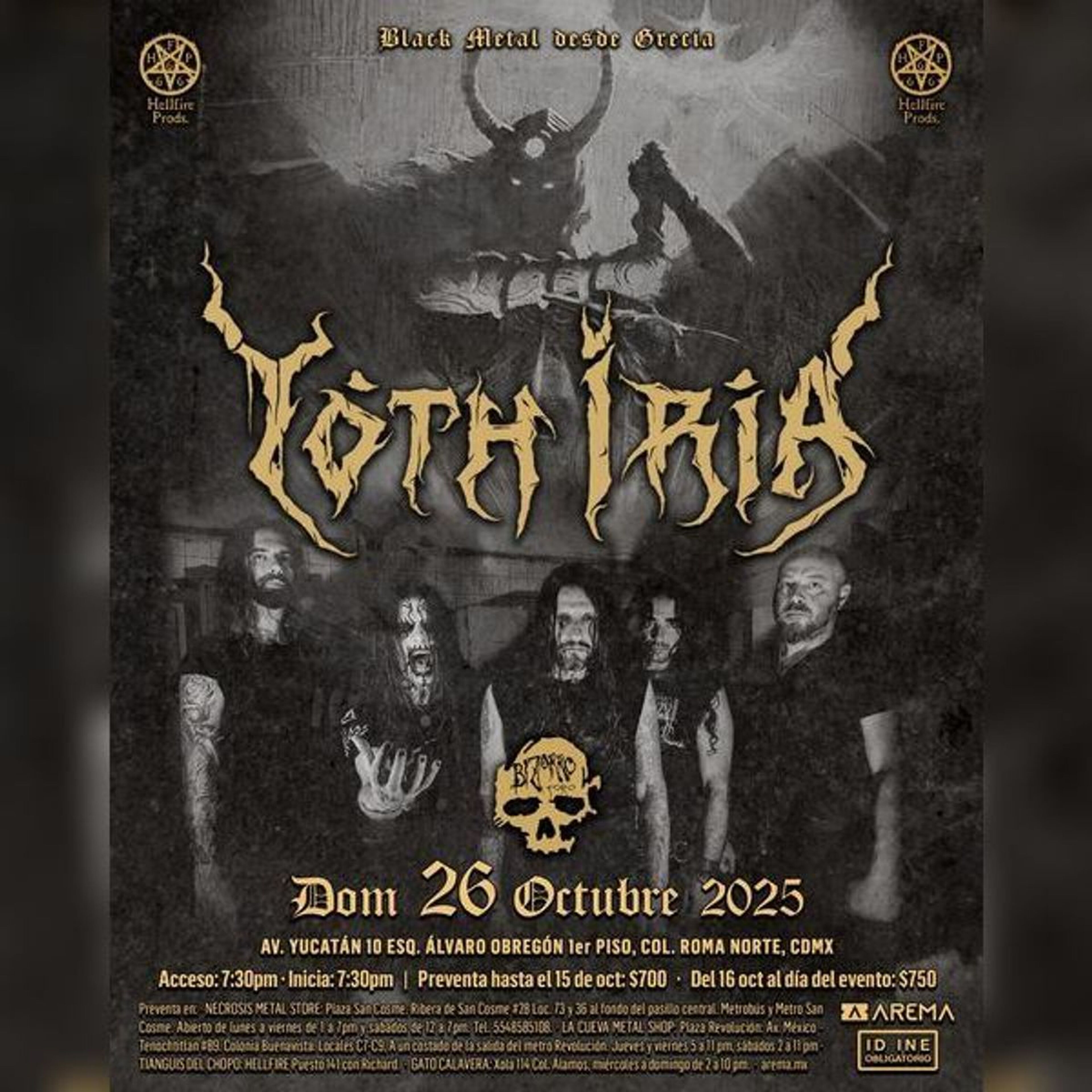 La agrupación griega de black metal Yoth Iria (Yoth iría) regresa a la Ciudad de México con su ritual corrosivo en el Foro Bizarro, presentando una atmósfera intensa y oscura, acompañada por bandas aliadas como Full Öf Hate y Through Torment. Una noche para los seguidores del sonido extremo, el ocultismo y la intensidad sonora.