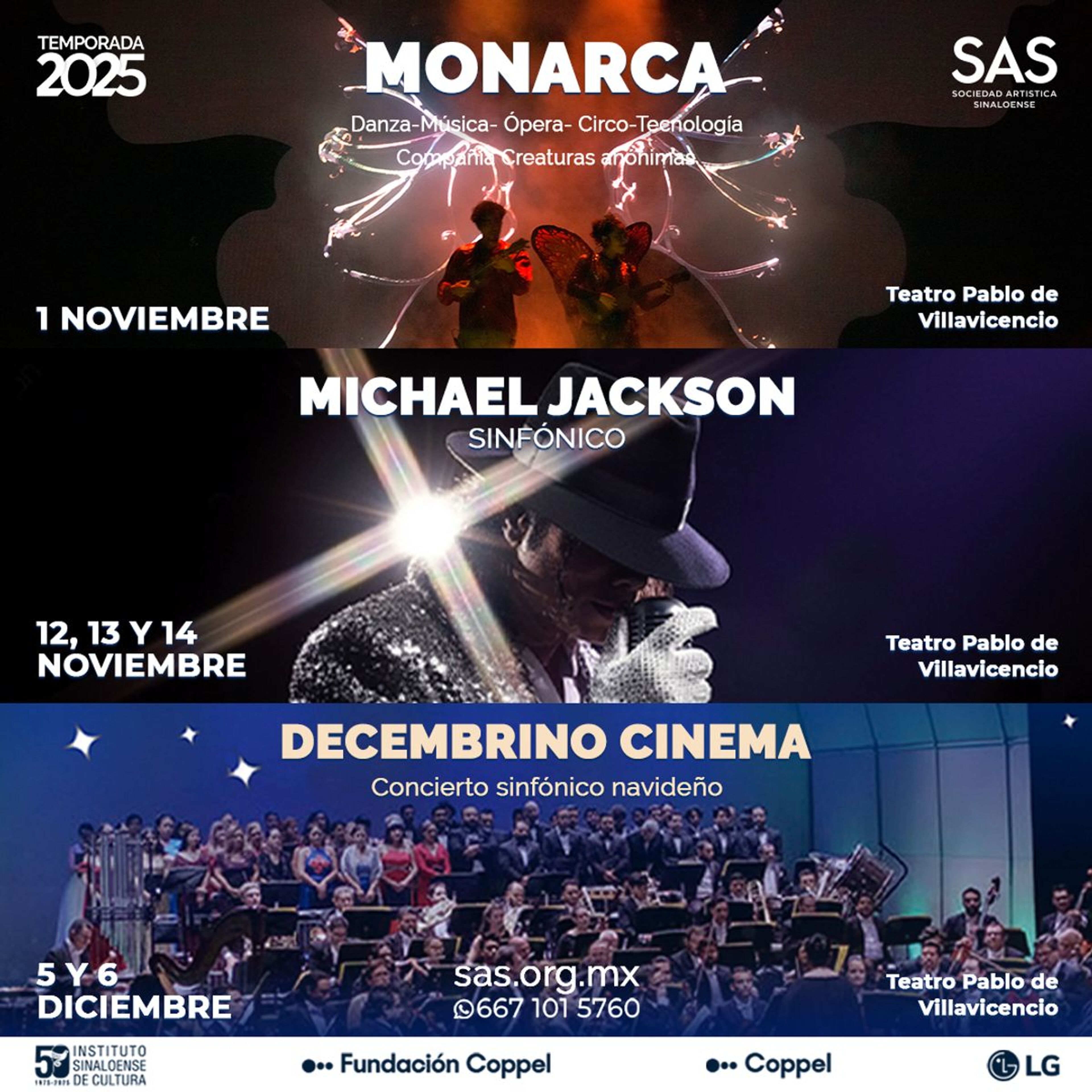 La Sociedad Artística Sinaloense nació en 1999 debido al interés de cubrir la necesidad y vacío de eventos culturales y de esparcimiento de calidad para las familias y habitantes de Culiacán, Sinaloa, México. Por ello, desde hace más de 25 años trabaja en promover y difundir la cultura y las artes en sus diversas manifestaciones: conciertos, ballets, óperas, musicales, obras de teatro, conferencias, cursos y talleres. Todo con el fin de enriquecer la sensibilidad y la vida de nuestra comunidad. El mismo año de su fundación, conforma diversas alianzas de cooperación cultural con actores públicos y privados con el fin de obtener el apoyo y los medios para realizar una temporada anual de espectáculos con artistas y propuestas de talla internacional. La Temporada se convierte desde entonces en el programa insignia de la SAS significando un factor de cambio en la comunidad pues enriquece la oferta cultural y de esparcimiento e implementa una nueva forma de promover los eventos y despertar el interés por asistir.